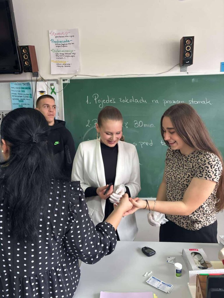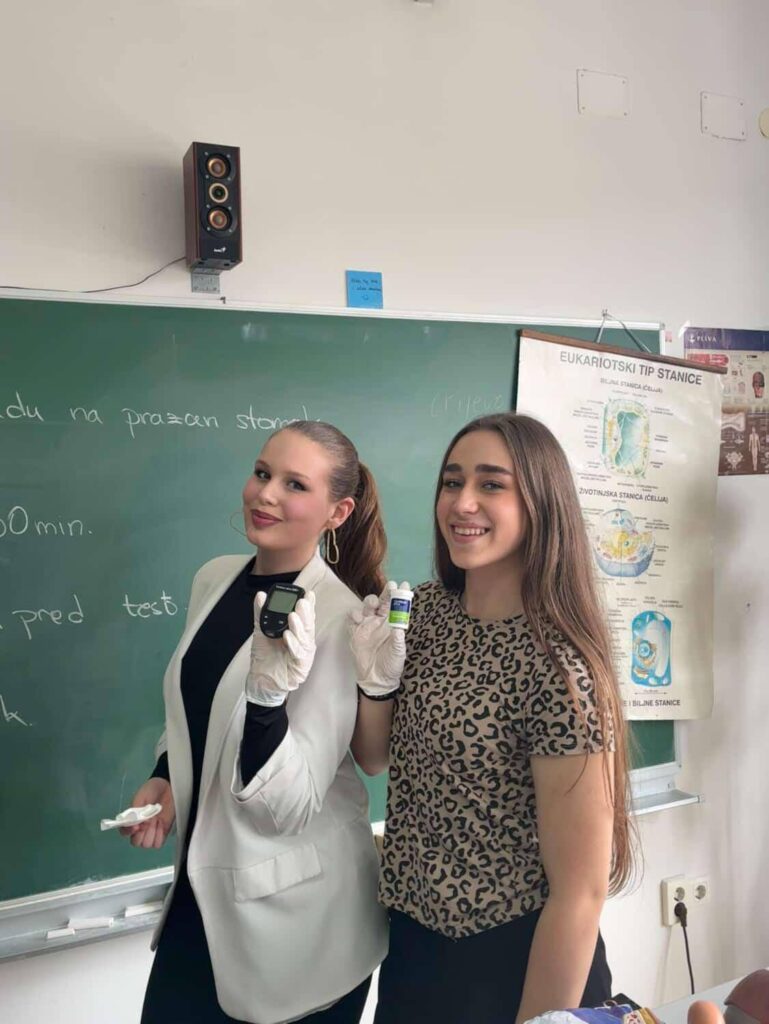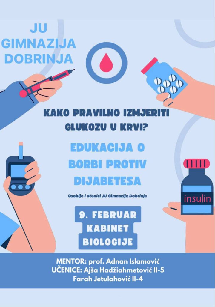 U ponedjeljak, 9. februara su učenice II razreda, Ajša Hadžiahmetović (II-5) i Farah Jetulahović (II-4) održale predavanje na času biologije o EDUKACIJI O BORBI PROTIV DIJABETESA, uz mentora prof. Adnana Islamovića. Kroz svoje predavanje, praktično su pokazale kako se pravilno vrši mjerenje glukoze u krvi. Predavanje je bilo izuzetno korisno, zanimljivo i edukativno.