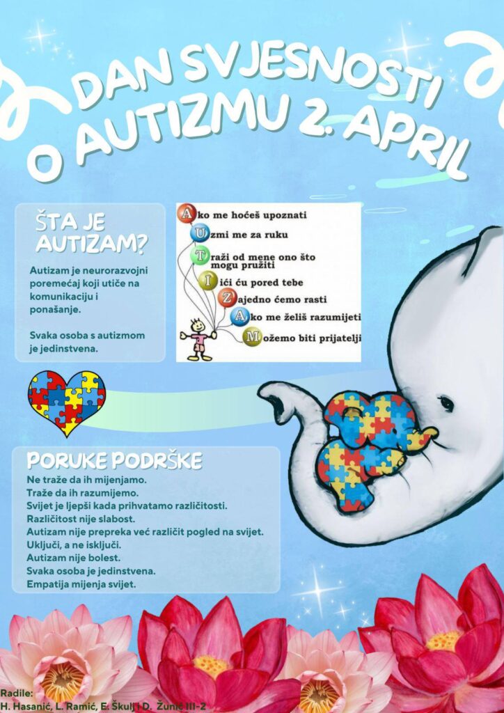 Učenici III-1 i III-2 razreda danas su simbolično obilježili ovaj važan dan istražujući o autizmu i izrađujući online plakate na času psihologije kod prof. Belme Duvnjak. Kroz ovu aktivnost poseban naglasak stavljen je na prihvatanje različitosti i stvaranje inkluzivnog okruženja u kojem se svako dijete osjeća sigurno, poštovano i vrijedno. ![]()