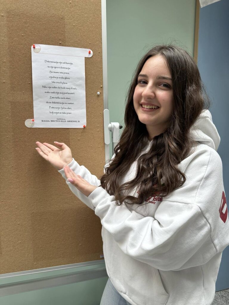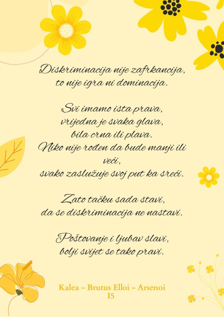 U okviru programa :”RAZLIČITOSTI U DRUŠTVU – PUT KA RAZUMIJEVANJU” učenica Kalea – Brutus Elli – Arsenoi (I5) napisala je autorsku pjesmu na temu diskriminacije, šaljući snažnu poruku o jednakosti, poštovanju i prihvatanju različitosti.