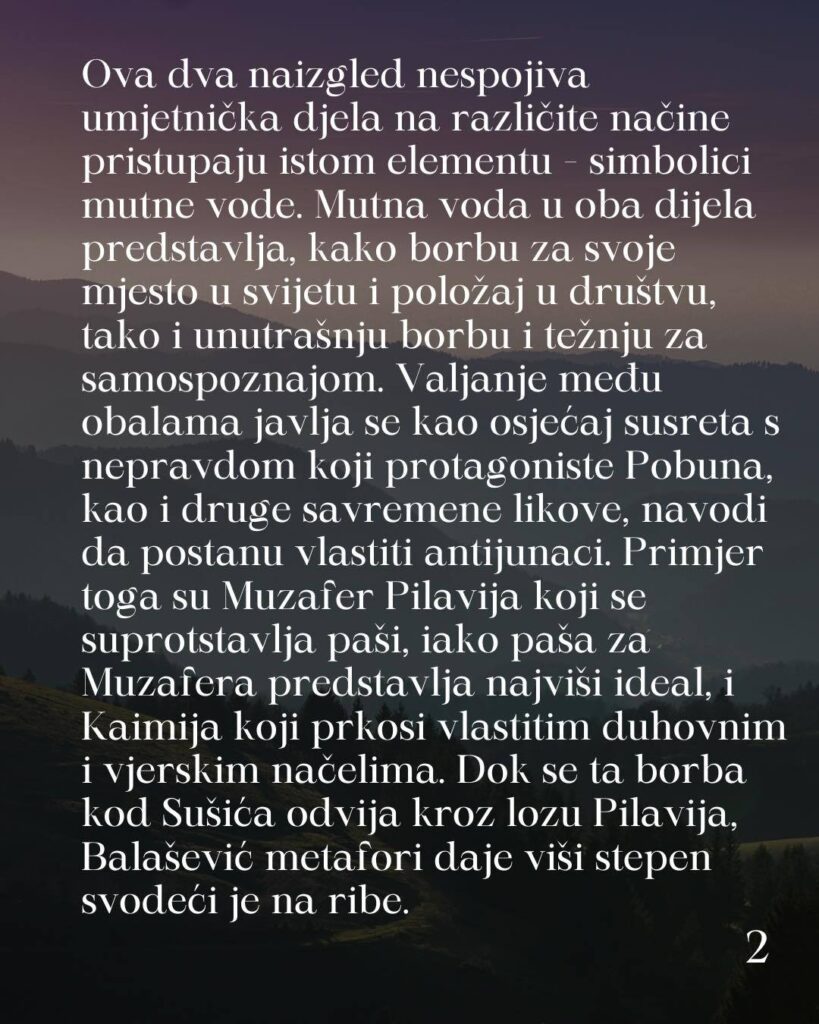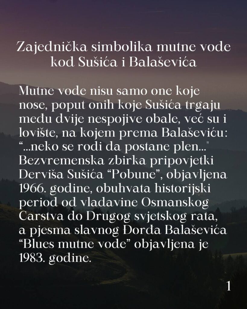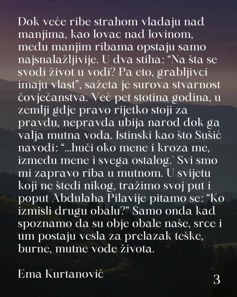 Učenica Ema Kurtanović (IV 4) napisala je misaono snažan esej u kojem je originalno povezala Sušića i Balaševića kroz simboliku mutne vode kao prikaz životne borbe, nepravde i traganja za sobom.